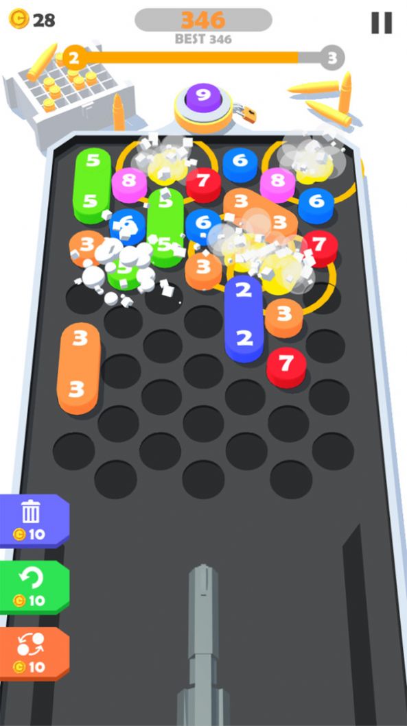 这是一款趣味消除类闯关游戏,玩家需要通过发射子弹消除同色方块。游戏既考验射击技巧,也对瞄准精度有要求。发射子弹时要控制好力度,否则可能出现子弹偏离目标、未能击中同色方块的情况,保持稳定操作是通关的关键。