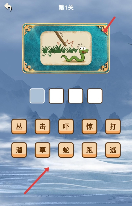 3、按照思考结果,从下方给出的汉字里,依次点击合适的字填入上方空格,组成你猜想的成语。