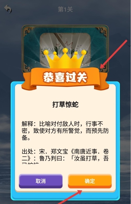 4当填入的字能构成正确成语时,系统会弹出“恭喜过关”的提示,同时展示该成语的释义与出处。点击确认按钮后,即可进入下一个关卡继续挑战。