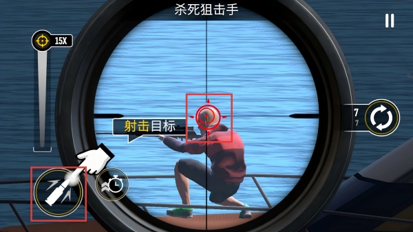4、后续在【杀死劫持者】任务中,同样用瞄准镜锁定,并注意子弹数量,把握时机,避过人质,狙杀罪犯,守护城市安全。