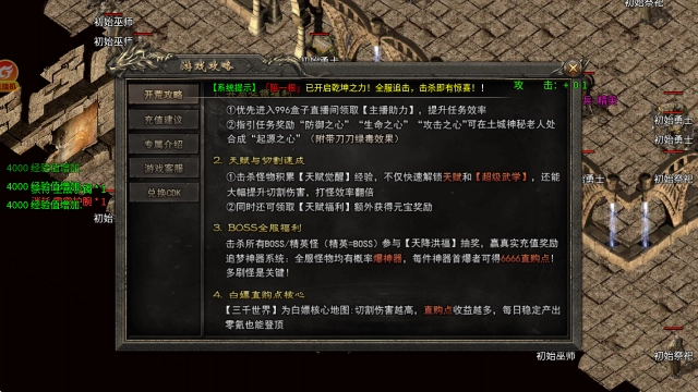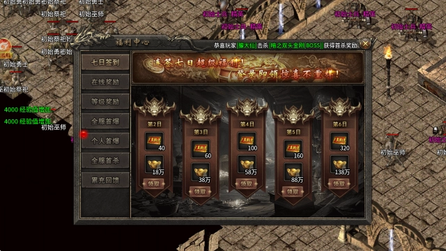 3、击杀本服所有BOSS均可参与“天降洪福”系统,领取海量充值。