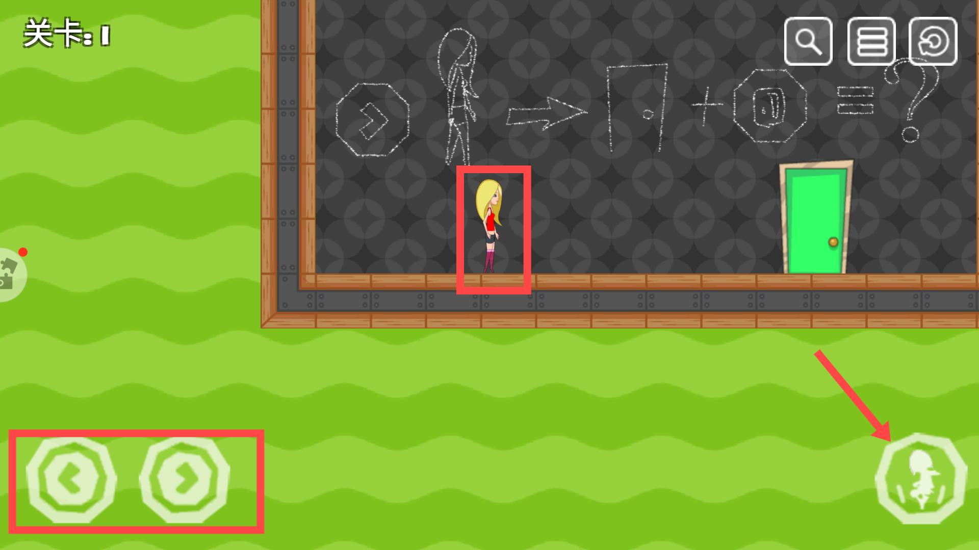 2、控制角色移动,通过左下角的方向键调整位置,留意黑板上的线索,按照提示靠近目标区域,触发机关或拾取道具,开启前往下一处的门。