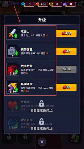 3、使用血液升级【攻击力】【携带容量】等属性,提升角色战斗与资源收集的效率。