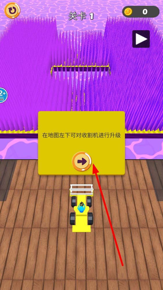 1进入关卡界面后会弹出提示窗口,告知可在地图左下角升级收割机;点击窗口内带箭头的按钮即可关闭提示并启动游戏。