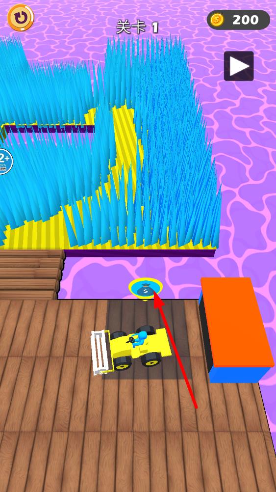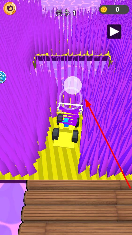 2驾驶黄色的收割设备在紫色的草丛地带移动,按照箭头所指的方向行进,通过收割草丛来打通通路,过程中要留意避开路上的阻碍物。