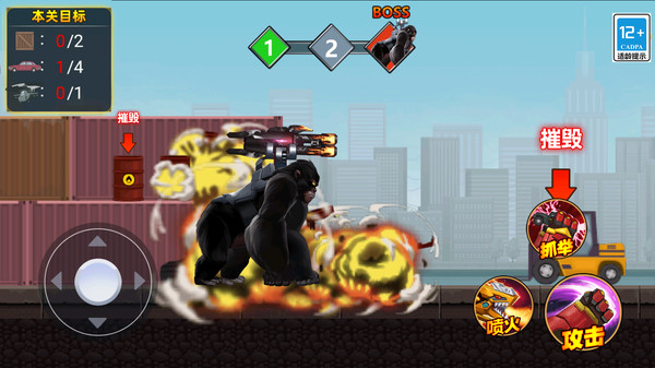 1、操控已选中的怪兽,运用攻击、喷火等技能,破坏关卡里指定的物品,达成基础任务。