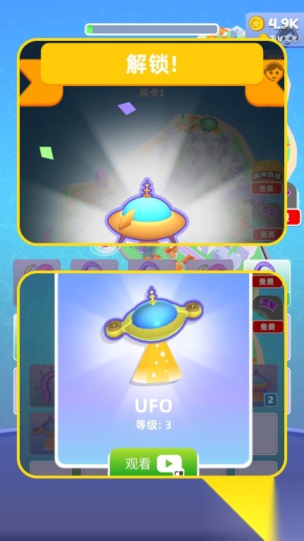 1、通过推进进程或完成任务,解锁不同等级的UFO、怪物等元素,丰富可使用的道具库。