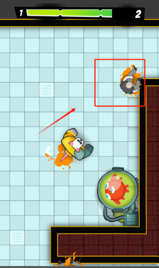 3战斗已然开启,画面下方的鼠形角色正发动攻势,右上角身着灰衣的对手头顶浮现出血条,右下角那台嵌着眼睛的红色装置则在施展技能。