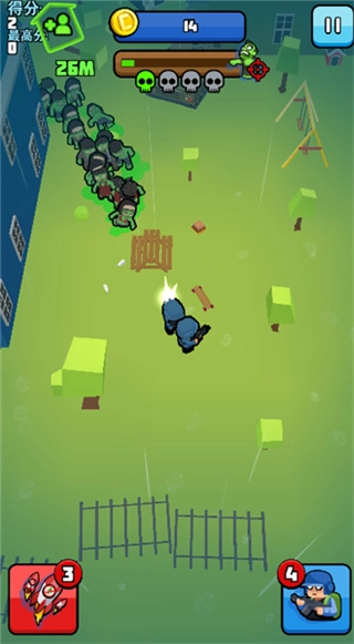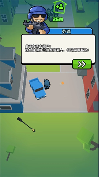 1、首先只需要通过控制人物来进行移动即可,角色遇到僵尸会自动进行射击;