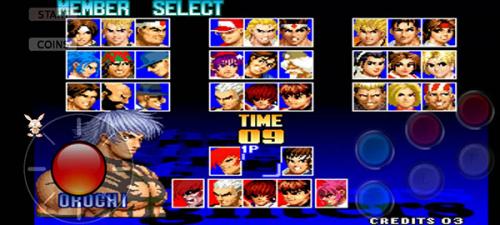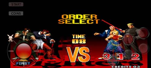 1、先安装本站提供的拳皇97手机版游戏,完成后投币并确认开始游戏,接着挑选我们喜爱的英雄角色。