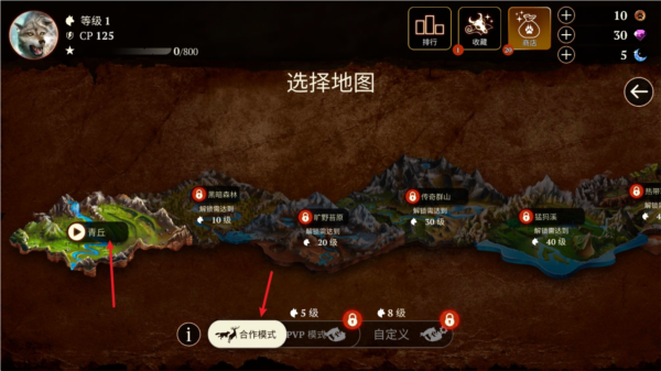 2、接着就是选择地图了,等级高了之后还可以去体验PVP模式哦。