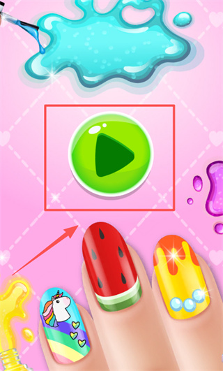1、进入游戏主界面后,点击中间绿色圆形按钮内的黑色三角形播放键,界面下方会呈现四种美甲样式供你挑选,选好后点击开始游戏。