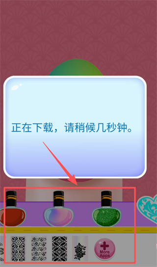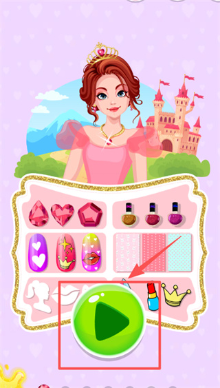 2、在公主主题页面,可点击底部粉色框区域呈现的美甲饰品,也能点击绿色圆形按钮内的黑色三角来开启美甲游戏。