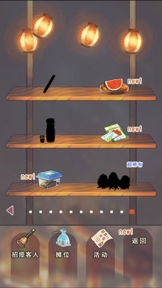 2游戏里的摊位主要有炒面、造型糖、刨冰、章鱼烧和捞金鱼这五大类,小镇区域有三家,鸟居区域有两家,它们都以十分亲切的模样呈现在你眼前。你可以开设店铺,升级摊位还能吸引更多新访客到来。