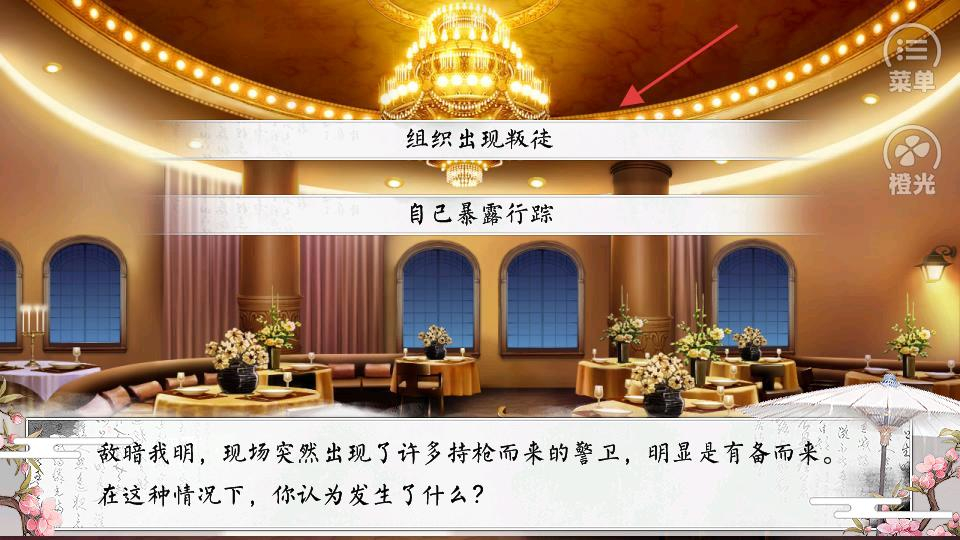 3、面对现场众多持枪警卫,需要在组织出现叛徒与自身行踪暴露这两个选项中做出抉择,从而触发相应的后续情节,推动故事线不断发展。