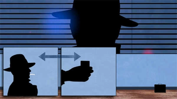 4、按照下图所示调整图片方向,在警察开枪射击的瞬间,主人公纵身一跃,桌子随即侧翻在地挡住子弹,主人公就能借此机会跳窗逃离。