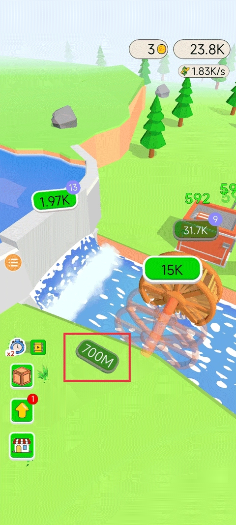 1、启动游戏后,第一步点击绿色的“2”按钮,即可立即建造一座水力发电机。