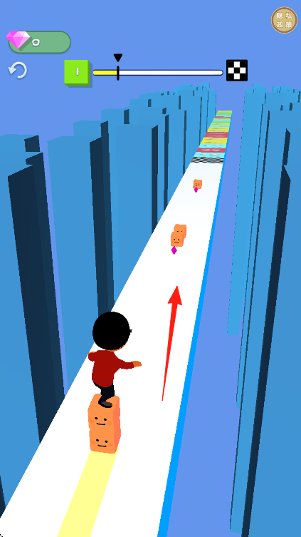 1、游戏启动后,玩家需操控红衣角色踏上方块向前行进,同时注意屏幕顶部的绿色进度条以及初始数量为0的钻石。