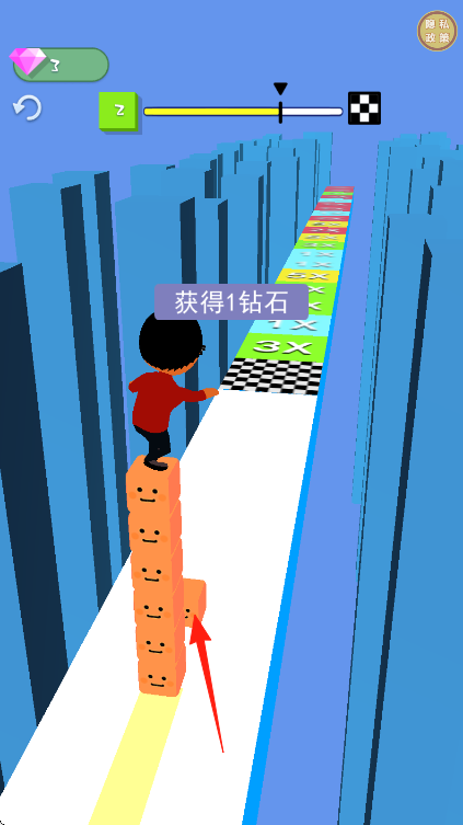 3、不断向前推进,帮助角色成功穿过终点处的黑白格子区域,以此完成当前关卡,赢取钻石奖励,为接下来的游戏进程做好铺垫。