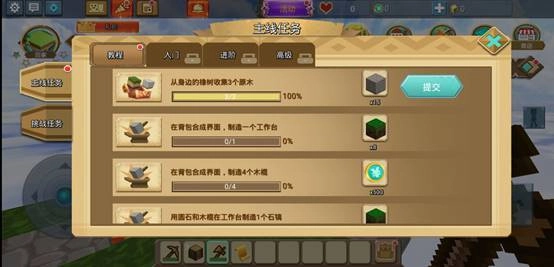 对准树干长按屏幕,就能砍掉树木并获取橡木方块,点击右侧的任务按钮提交任务,即可领取奖励。