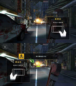 屏幕左半部分为人物移动控制区,右半部分则是视角调整区域。(相比死亡扳机1代,灵敏度提升了不少)