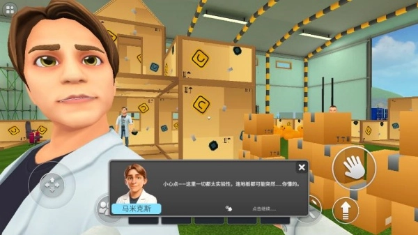 2、玩法十分简单,左边的摇杆用于控制角色移动,右边的按钮则是操作键;当靠近其他科学家时,点击右边的信息键就能和他们进行交谈。