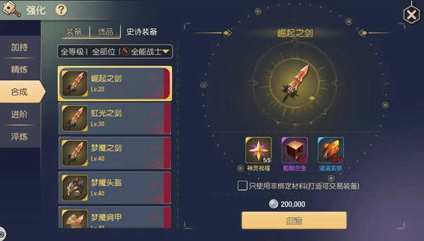 4、 装备合成:这是获取极品金色装备的主要方式,可分为职业装备与史诗装备两种类型,合成过程需要消耗图纸、金色材料以及采集材料;(推荐值:✩✩✩✩)