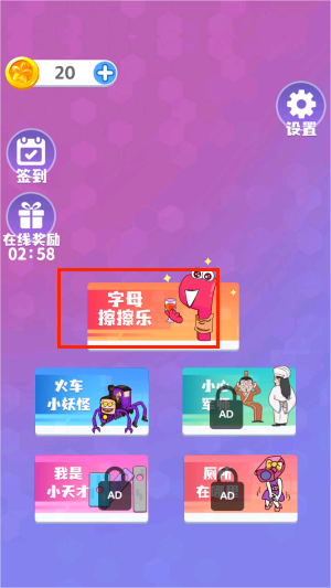1在游戏主界面找到对应的趣味字母游戏入口,进入后会看到表面带有遮蔽效果的字母卡片。