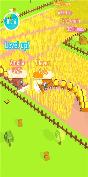 在这款轻松解压的农场经营游戏里,你能沉浸式体验农忙时节的丰收喜悦。游戏支持多人联机竞技,大家比拼的是农作物收割的效率——在限定时间内,谁的收割进度占比更高,谁就能赢得最终的胜利。它采用清新简约的美术风格,玩法简单易懂、趣味性十足,一局游戏仅需几分钟就能结束,是闲暇时光里打发时间的绝佳选择。