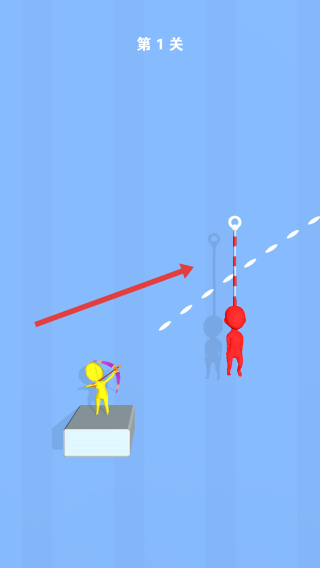 1进入第一关后,需要操控黄色的弓箭手角色,对准红色的目标物,规划好箭矢飞行的路径,通过射击来割断绳索,从而救出目标,以此达成关卡要求。