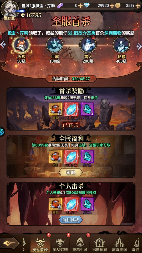 4、成功击杀全服BOSS后,所有服务器内的玩家都能够领取钻石、元素水晶、秘文晶等奖励。