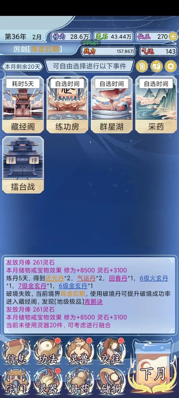 总结:五灵根开局,气运90以上,日常就是采药、炼丹、嗑药三点一线,藏宝阁有机会就去点