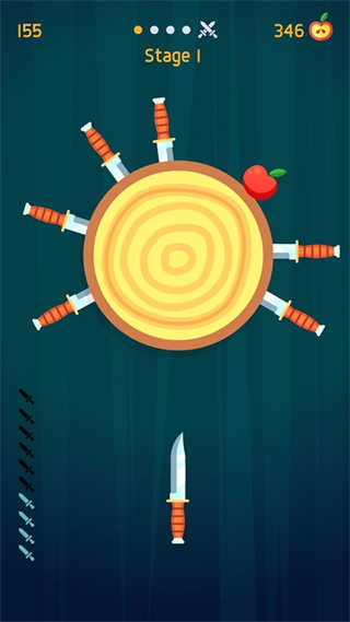 2、动态进度 - 飞刀打击游戏左下角会显示目标飞刀数量,在游戏过程中,玩家还能获得苹果奖励。