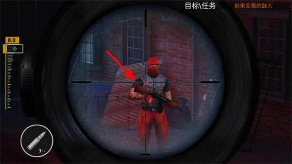3、瞄准敌人时,要把准星对准其身体的关键部位(比如手臂),这样才能保证射击命中并造成有效伤害。