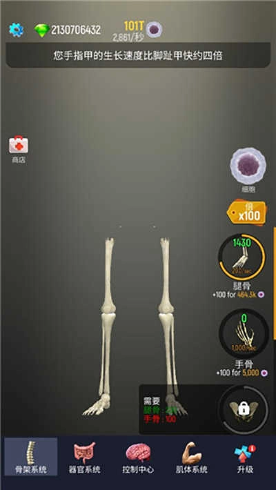 2、从最初的骨架开始解锁,我这里有,所以直接用钻石购买了100T的细胞来进行养成。