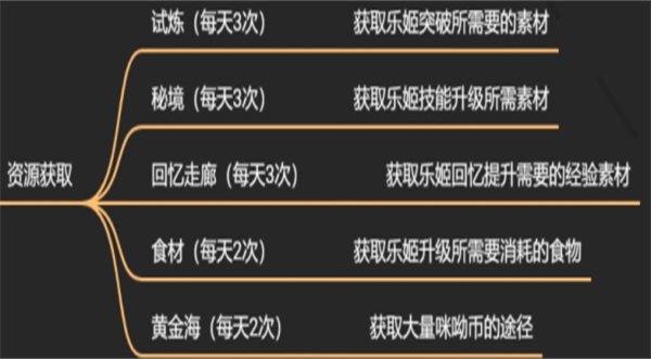 二、 想变得更强大欲要变强,必先去打每日限量的资源获取关卡!那么资源获取关卡主要分为五个部分,分别可以获得游戏普通的咪哟币、乐姬升级所消耗的食物、乐姬回忆以及回忆所需要的经验素材、乐姬技能升级材料、乐姬等级突破材料。强烈建议指挥每天都打完这些副本哟,毕竟这可是游戏中最主要的资源获取途径之一。
