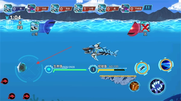 1、在海洋中探索遨游时,可通过滑动左侧屏幕来操控机械鲨鱼。