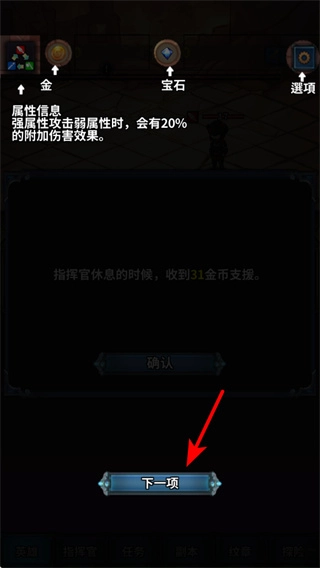 1、在游戏里点击“下一项”,就能查看新的游戏信息、属性说明以及资源获取方式,以便为后续的战斗和发展制定合适的策略规划。