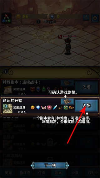 4、点击“入场”按钮即可进入副本场景,进入前可以查看副本的难度等级和对应的奖励内容,建议结合自身队伍的实际战力情况,选择难度合适的副本进行挑战。
