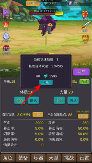 2、点击升级按钮,消耗资源提升自动攻速档位,攻速提升后能加快攻击频率,提高打怪效率。