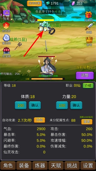 包含装备、炼器、天赋、挑战等多个系统,可通过这些系统强化气血、攻击、暴击率角色属性,搭配资源优势,提升修仙实力。