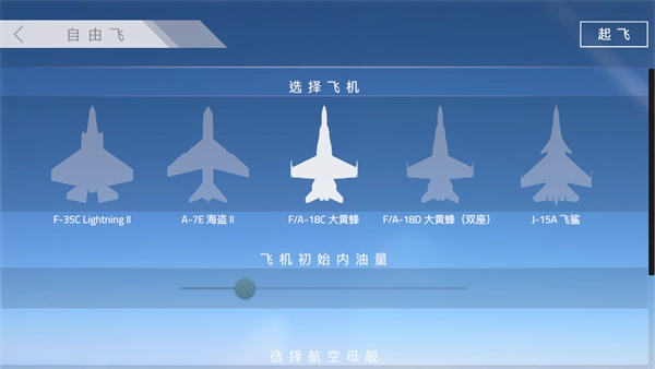 进入菜单后,可以选择自己喜欢的飞机,飞机初始内油量如果在执行降落任务时建议使用?默认油量,因为如果油量过多会使重量增大从而变得不灵活。 然后选择自己喜欢的航空母舰,接下来就是设置出生点,左右滑动可以获取更多出生位置,然后点击起飞即可开始游戏。