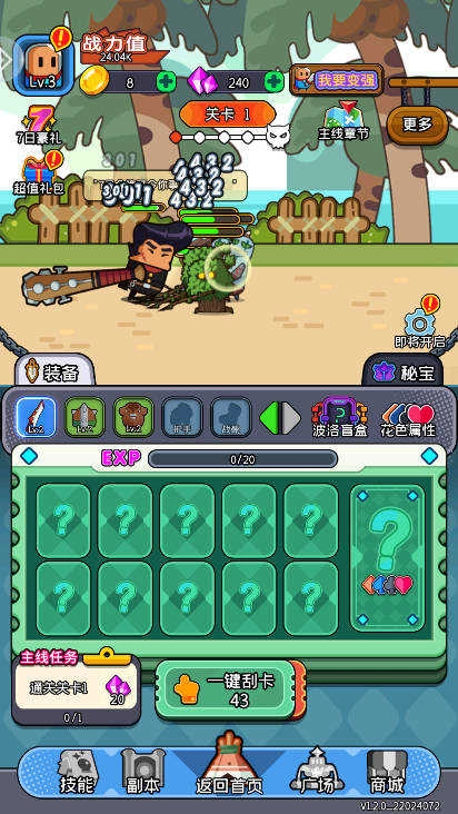 1、天天闯关》这款放置游戏,装备的核心获取途径是刮刮乐玩法,装备自身的属性由刮刮乐的中奖属性随机生成,这与市面上同类产品有显著差异。玩家能凭借极品、神品装备的强力属性实现“逆天改命”,更高效地完成关卡挑战!
