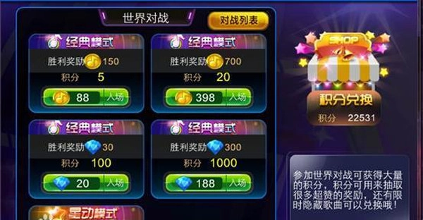 3、积分,在对战的过程中玩家获得的可以累积的对战积分累积到一定数量后,在世界对战界面右侧点击积分兑换则可以看到更多惊喜,不仅有好歌可以兑换体验,更可以通过使用消耗积分来抽奖,获得限时的好歌、超可爱的角色和道具。在积分兑换的界面点击我要积分按钮之后也可以至今使用钻石购买积分。