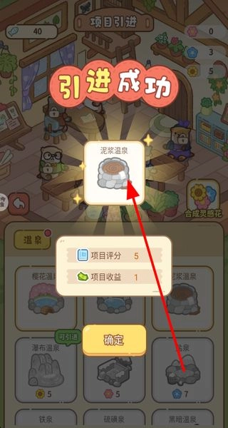 4、使用灵感花成功引进泥浆温泉等项目,获取项目评分和收益,提升浴场的经营收益。