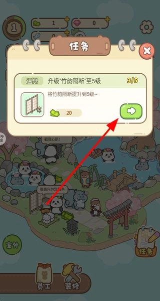 1、升级竹韵隔断的任务进度,完成后获取资源奖励,助力设施的升级,提升经营效率。