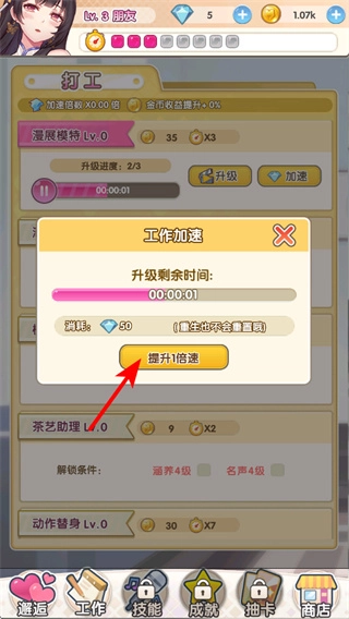 4、点击提升1倍速按钮,可加速打工项目的升级进程,这是优化资源获取的关键策略,根据钻石数量合理使用该功能。