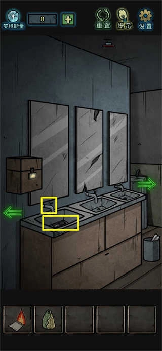 12、前往洗手间的洗手池区域,镜子左侧有一个可开启的小盒子,打开后能获取水龙头和一块神秘碎片。
