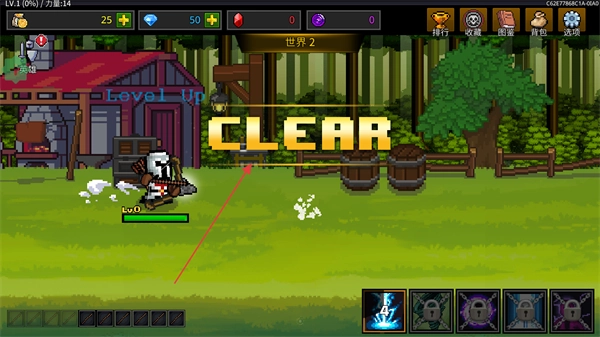 3、战胜敌人后,场景会显示CLEAR提示,此时关卡完成,新的场景(比如世界2)将被解锁。