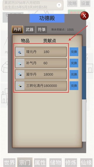 1、进入【功德殿】的【丹药】界面,使用贡献点兑换【增元丹】、【补气丹】这类丹药,能有效帮助提升修炼属性。